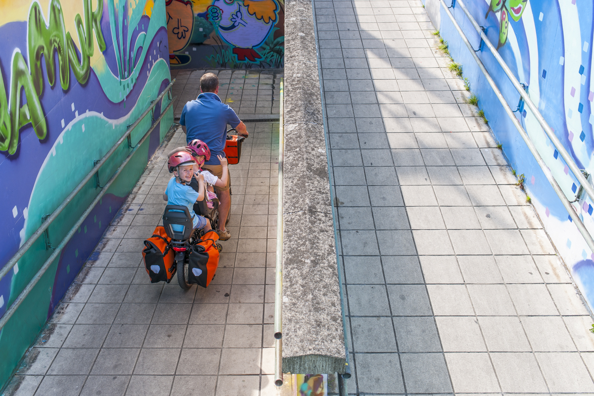 - Stabilité : le vélo a été spécialement réfléchi pour assurer une grande stabilité. Avec sa plus petite roue à l’arrière et la boxe à pieds pour l’enfant juste derrière le conducteur, le centre de gravité est en effet bien plus grand.