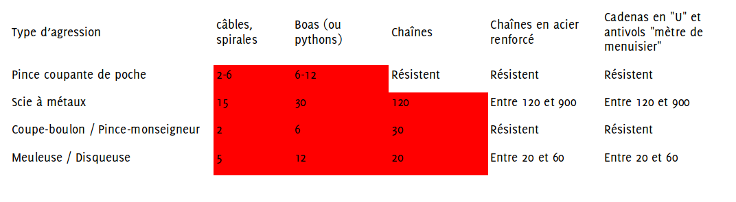 Afin de vous faire une idée, le tableau ci-dessous vous indique la durée moyenne de résistance des antivols pour vélo, en secondes :
