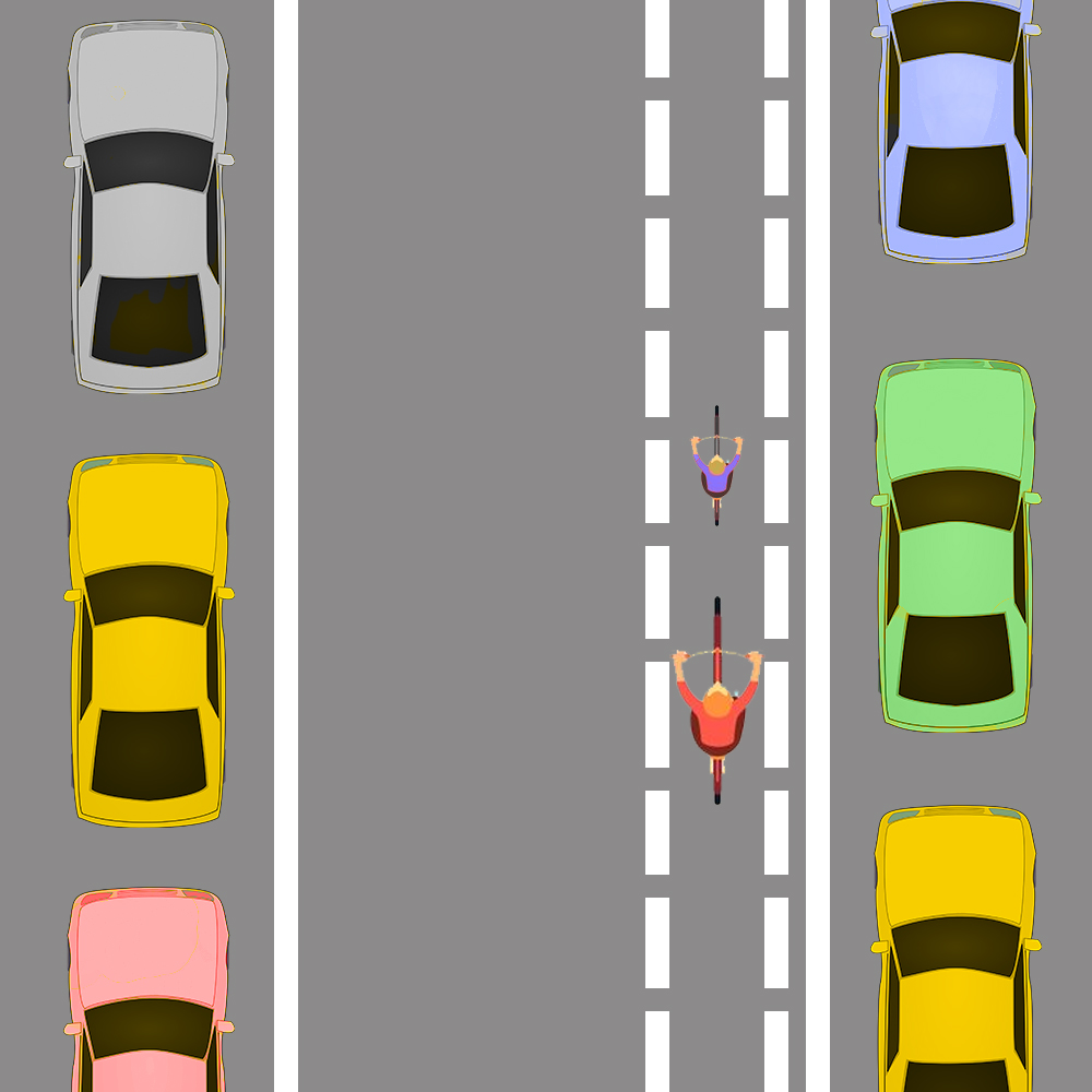 Als je op een weg zonder fietspad of met fietssuggestiestrook rijdt, positioneer je jezelf schuin achter het kind, langs zijn of haar linkerzijde. Op die manier is aanstormend verkeer verplicht om te vertragen, en kan je snel een duwtje bijgeven op een lastig te beklimmen heuvel. Als je een moeilijke situatie nadert, zoals een kruispunt of een dubbel geparkeerd voertuig, ga je schuin voor je kind fietsen en geef je duidelijke instructies.